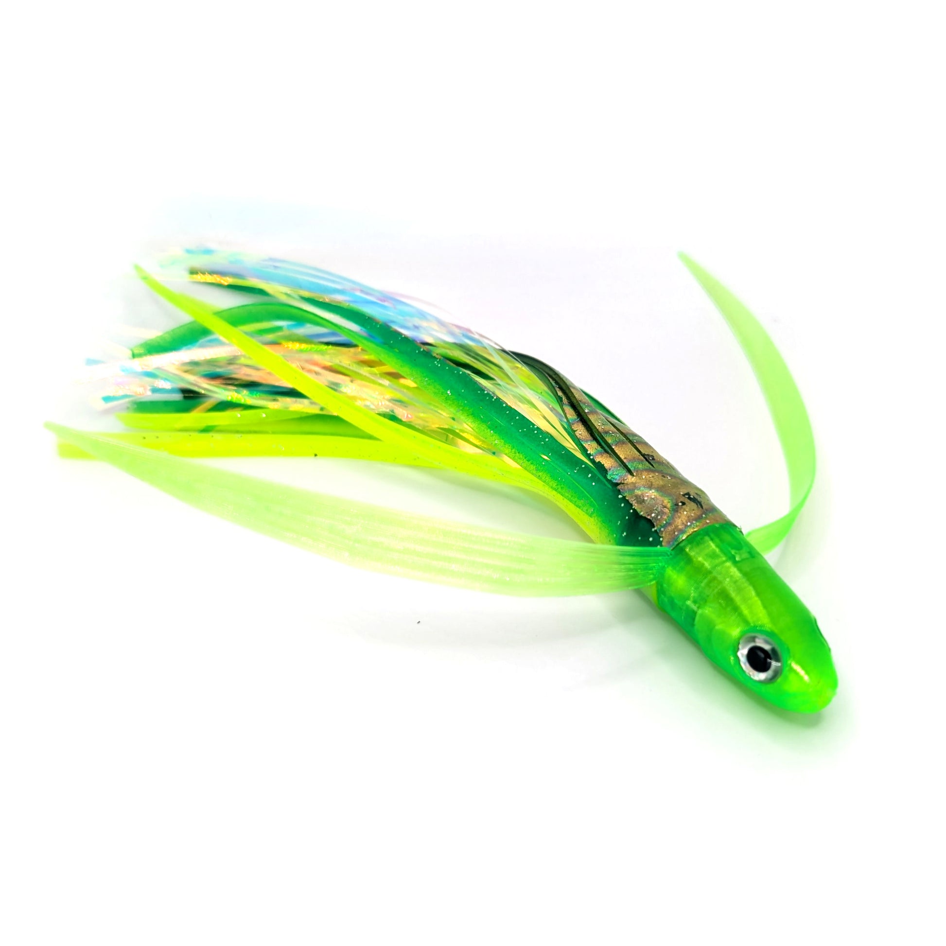 - Skirted with one rubber squid skirt and one mylar flash skirt